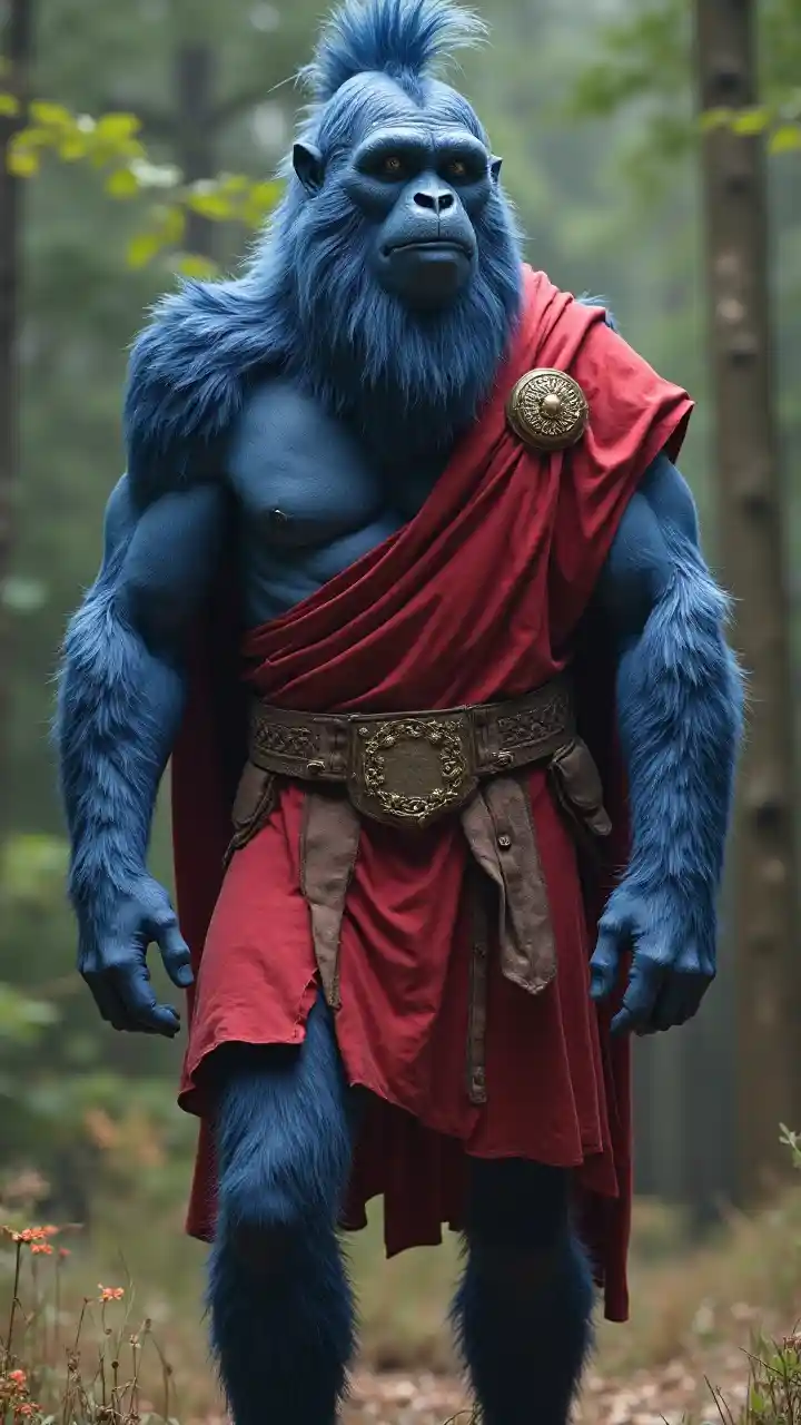 전신이 푸른 야만인으로 빛나고 입과 코가 제거되고 로마 군단 복장이 착용됨