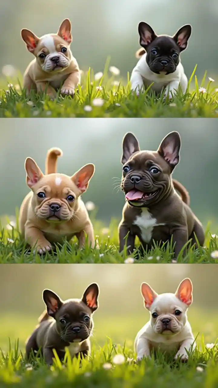 사랑스러운 프랑스 불독 강아지 다른 색상, 풀밭에서 노는 꼬리