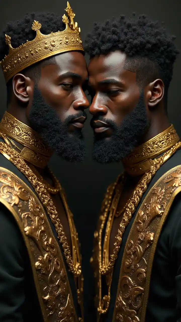 금색과 검은색 의상과 보석을 착용한 두 명의 흑인 남자, 왕관을 착용한 남자, 금색 사슬을 착용한 남자, 케오스 마손스, 아프리카 미래주의, 고도로 상세한 디지털 페인팅, 청동 조각
