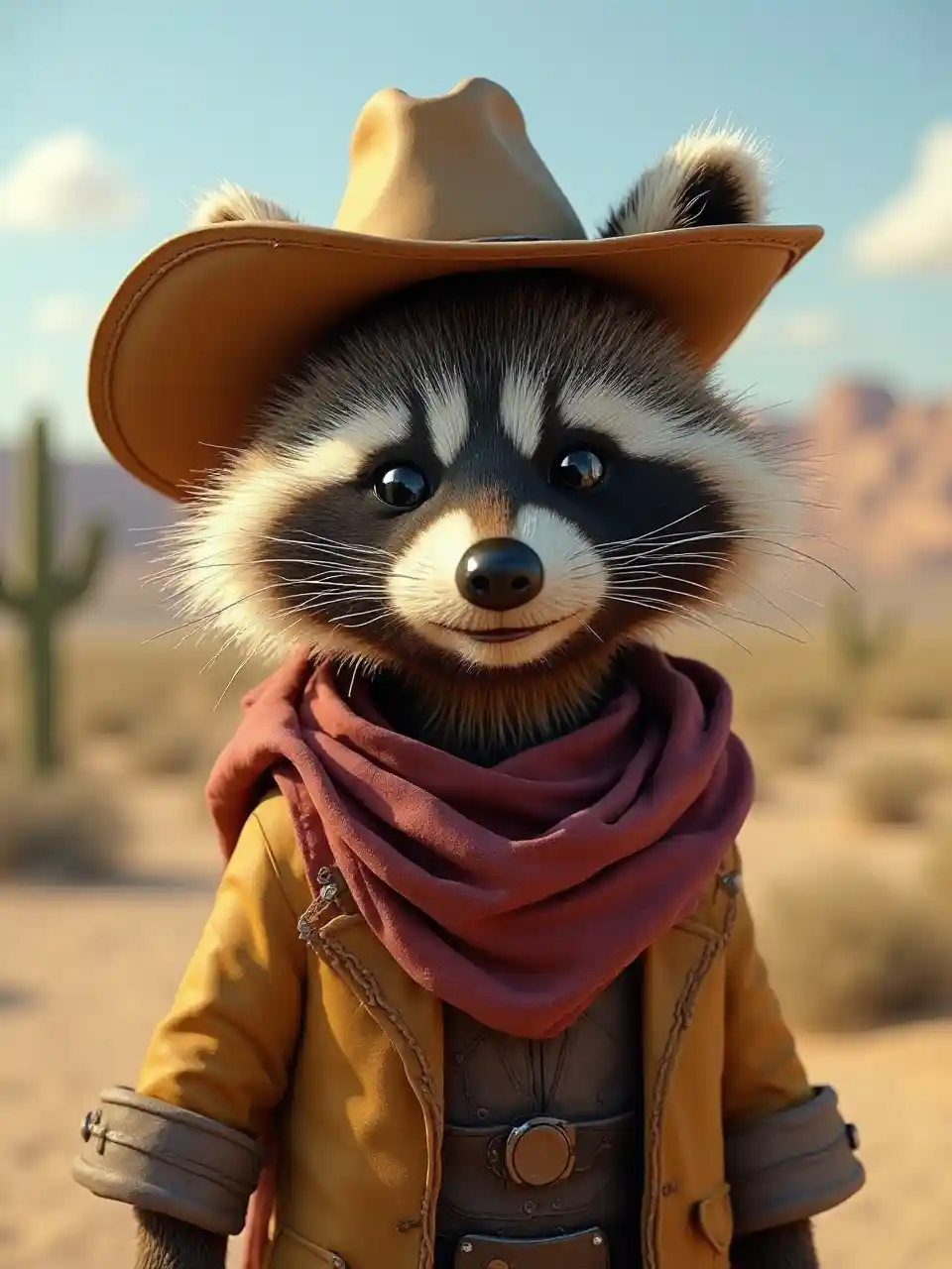 건방진 너구리.눈을 깜빡이다.사막의 나라와 서부의 환경에서 카우보이로 분장하기