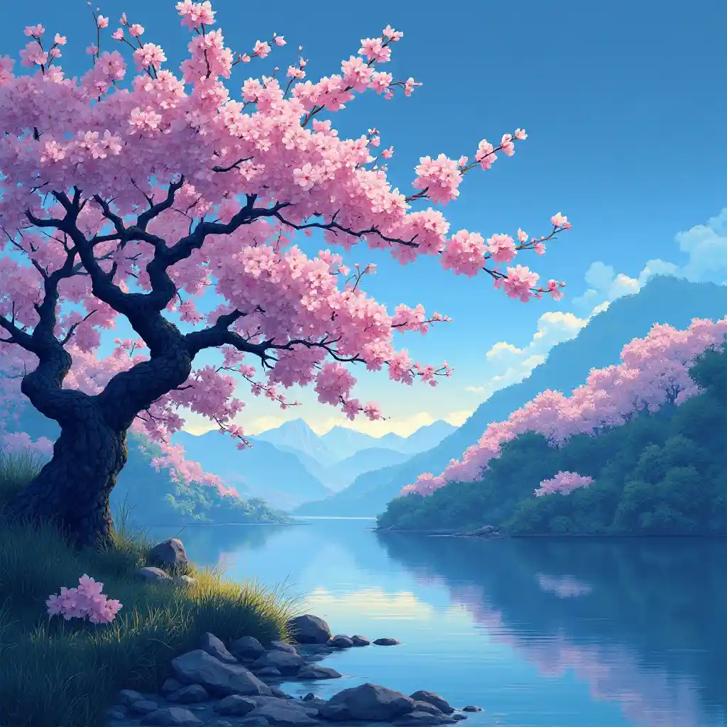 푸른 시간의 빛 아래 벚꽃의 사실적인 화법