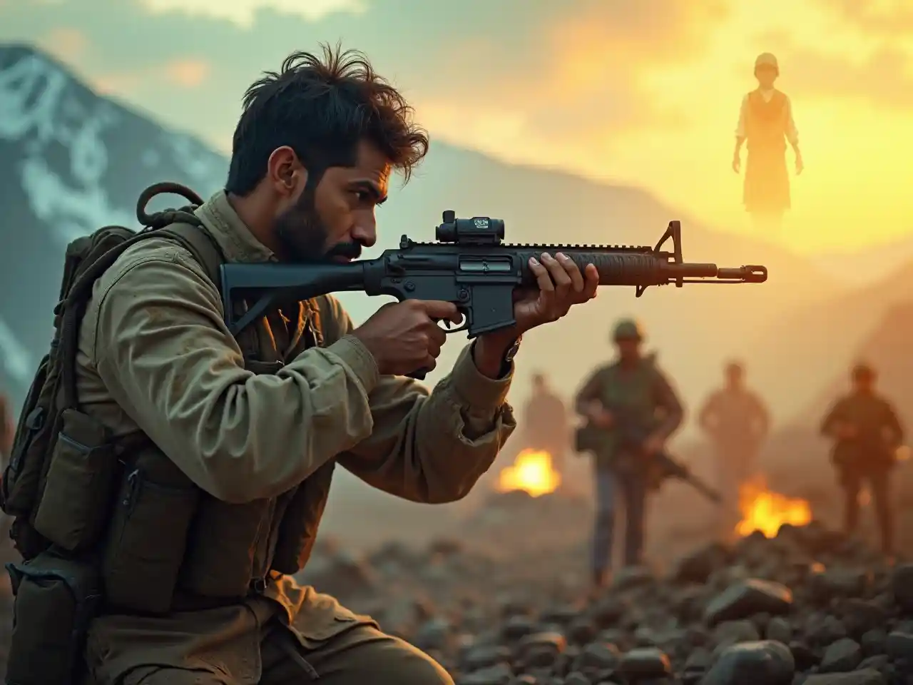 16:9 스케일 (3840x2160, 4K 해상도)의 초현실적인 초고급 영화 장면은 얼음과 눈으로 뒤덮인 히말라야 산맥을 배경으로 혼란스러운 전장에서 활동적이고 역동적 인 자세로 두려움 없는 인도 군인을 묘사합니다.진흙과 눈물과 전쟁의 흔적이 보이는 투박한 군복을 입은 이 군인은 마치 적과 싸우는 것처럼 소총으로 정면을 조준하고 있으며 강렬한 황금빛 석양광선과 극적인 렌즈 조명탄에 의해 날카롭고 단호한 얼굴을 하고 있습니다.사프란 사리를 입은 바라트 마타의 은은하고 빛나는 실루엣이 하늘을 희미하게 맴돌며 은은한 신성한 아우라를 발산하며 병사들에게 시선을 집중시키면서 영감을 상징한다.전장에서는 짙은 연기, 먼지, 흩어진 파편, 멀리서 폭발하는 소리, 다른 전사들의 희미한 모습이 전쟁의 본연의 강도를 사로잡았습니다.텍스트는 없고 시각적 요소만 있습니다.사프란, 골드, 다크 블루, 파이어 오렌지 팔레트를 사용하여 극적인 조명, 높은 대비 및 영화와 같은 피사계 심도 효과를 제공합니다.사실적이고 매우 디테일하며 4K이며 시적이며 감정적입니다. MidJourney 안정적인 확산 MidJourney:--ar 16:9--v 6--q 2 안정적인 확산: 부정적인 힌트: 흐릿함, 저품질, 만화, 비현실적, 텍스트 비율은 16:9입니다.매우 높은 프리미엄, 영화화 및 매우 현실적입니다.4k。