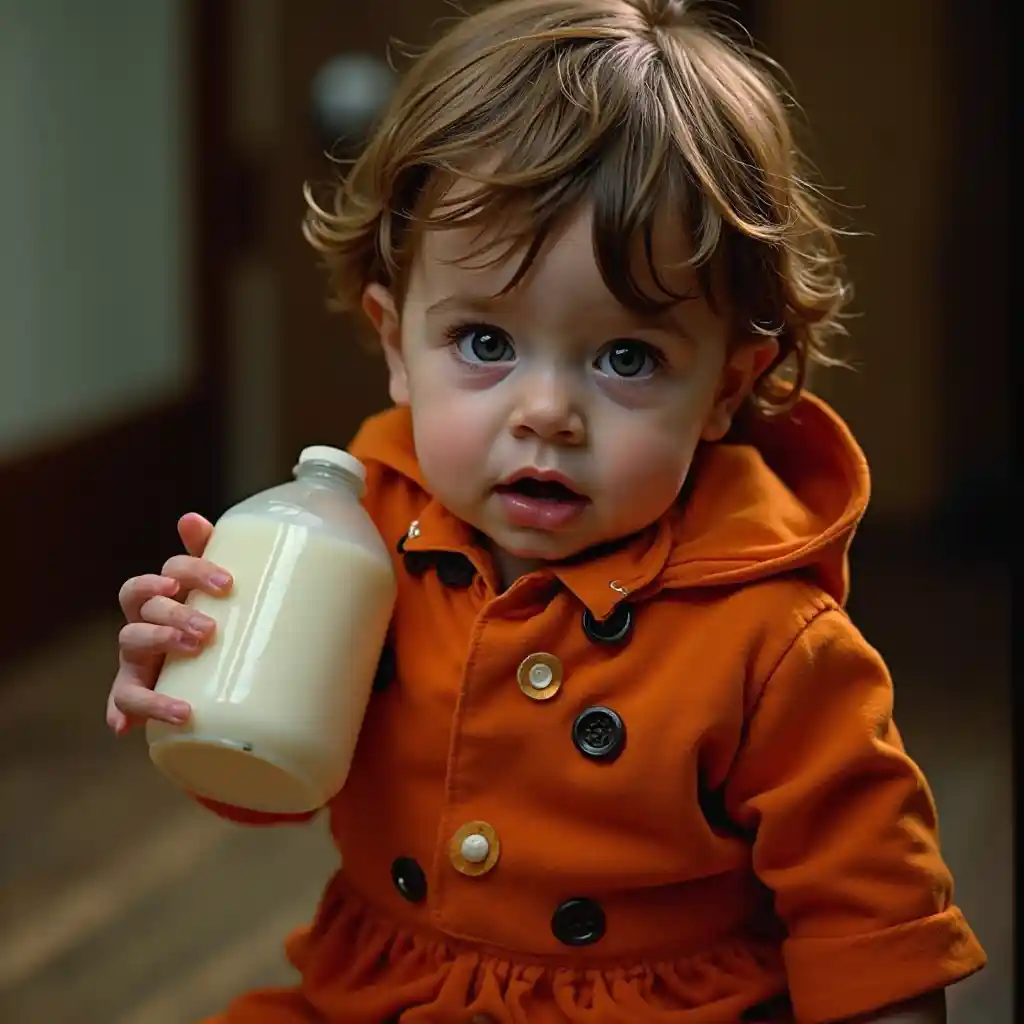 클락워크 오렌지 무비의 알렉스, 우유 한 병을 들고 있는 작고 귀여운 아기, 할로윈, 생생한 포화 색상, 대조 색상