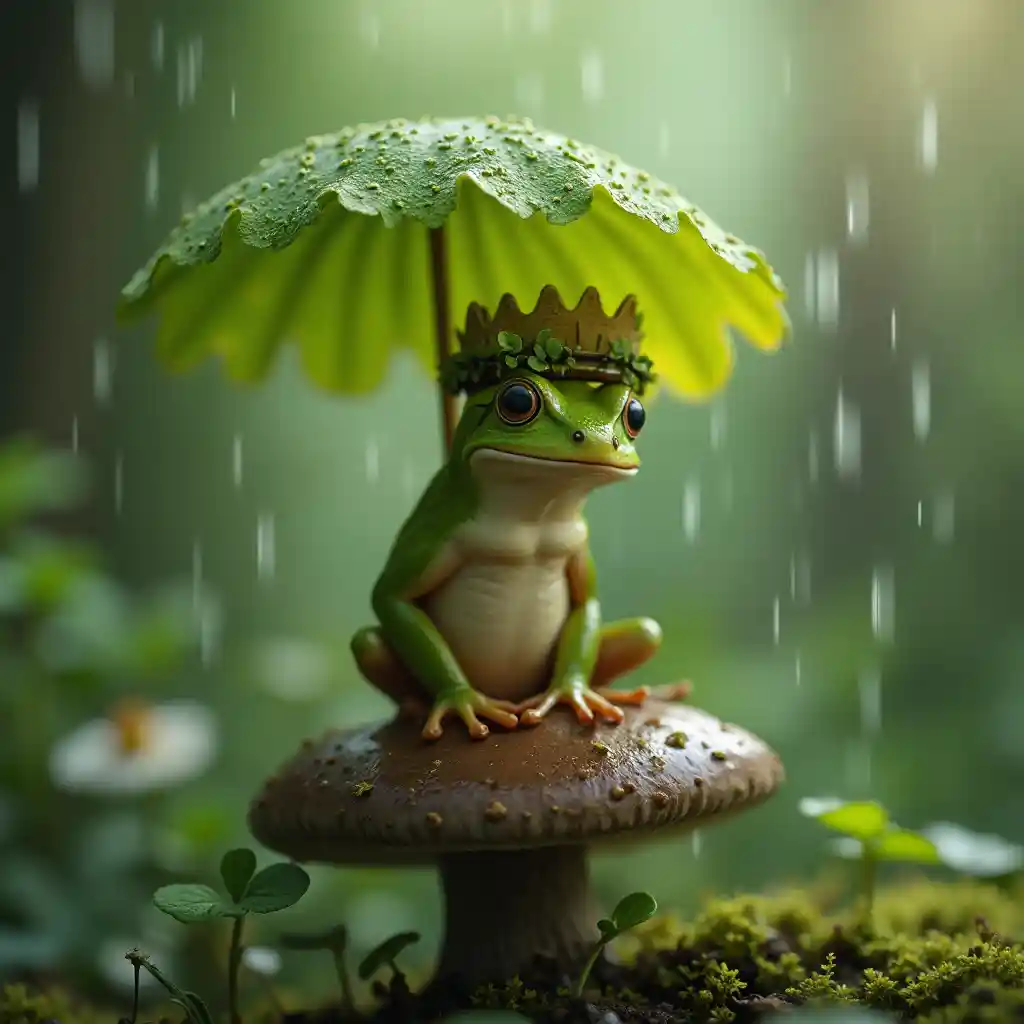 클로버로 만든 왕관을 쓴 작은 개구리가 나뭇잎 우산 아래 버섯 위에 앉아 약한 비를 내리고 있다