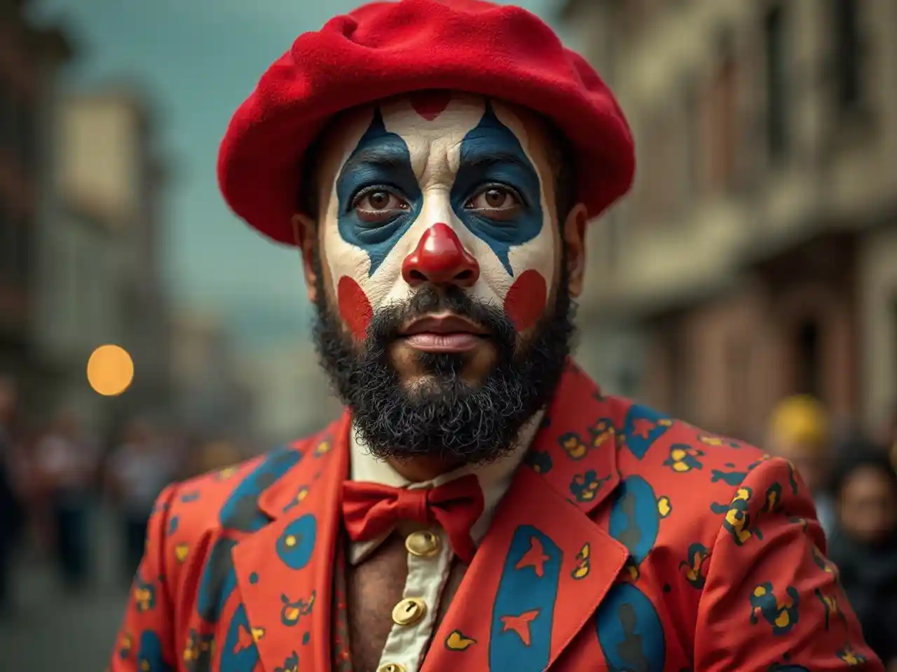 줄리어스 말레마는 머리에 빨간 베레모를 쓴 광대와 함께 서커스 광대 복장을 하고 있다.