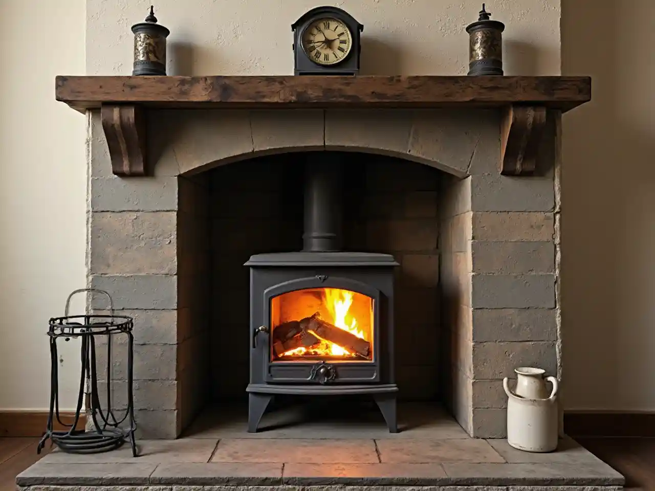 벽난로에서 타오르는 나무, 타일로 둘러싸여 있고 그 위에 오래된 시계가 매달려 있는 벽난로 조각이 있습니다.