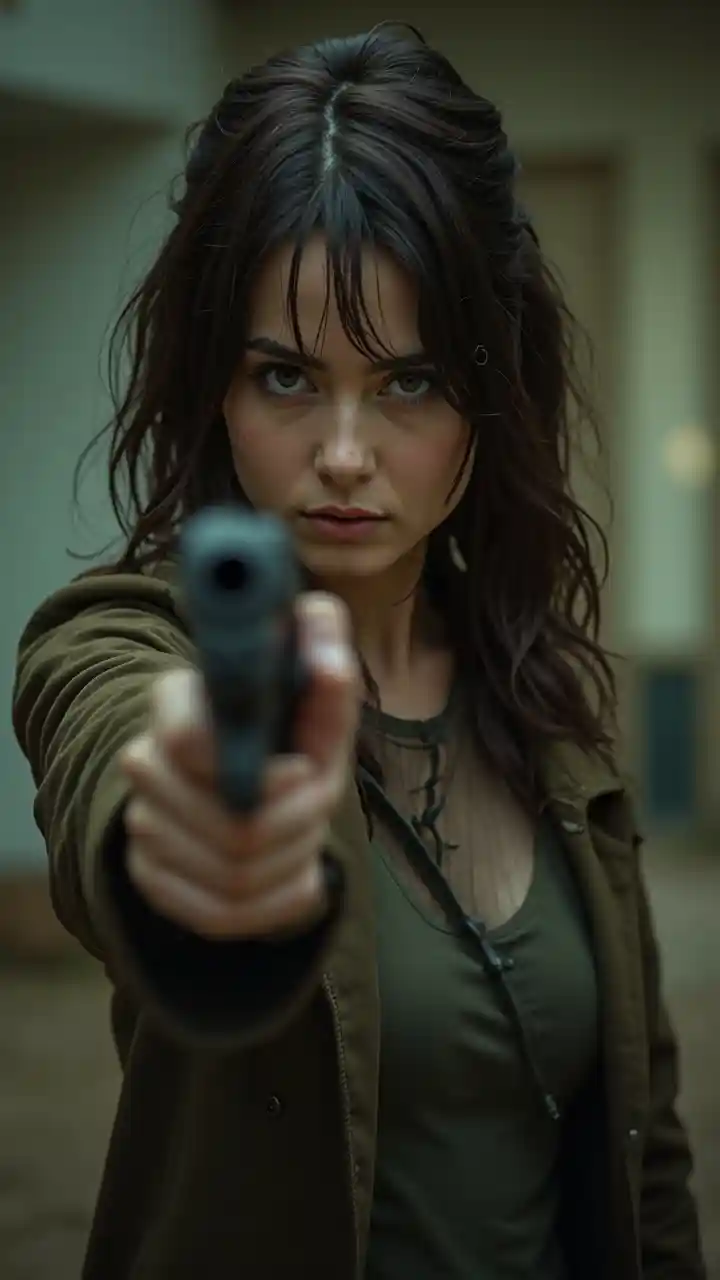 그녀는 호기심과 긴장으로 가득 찬 눈빛으로 총을 겨누고 앞으로 걸어갔고, 그녀의 움직임을 영화처럼 추적하는 영화 같은 장면으로 가득 찼습니다.