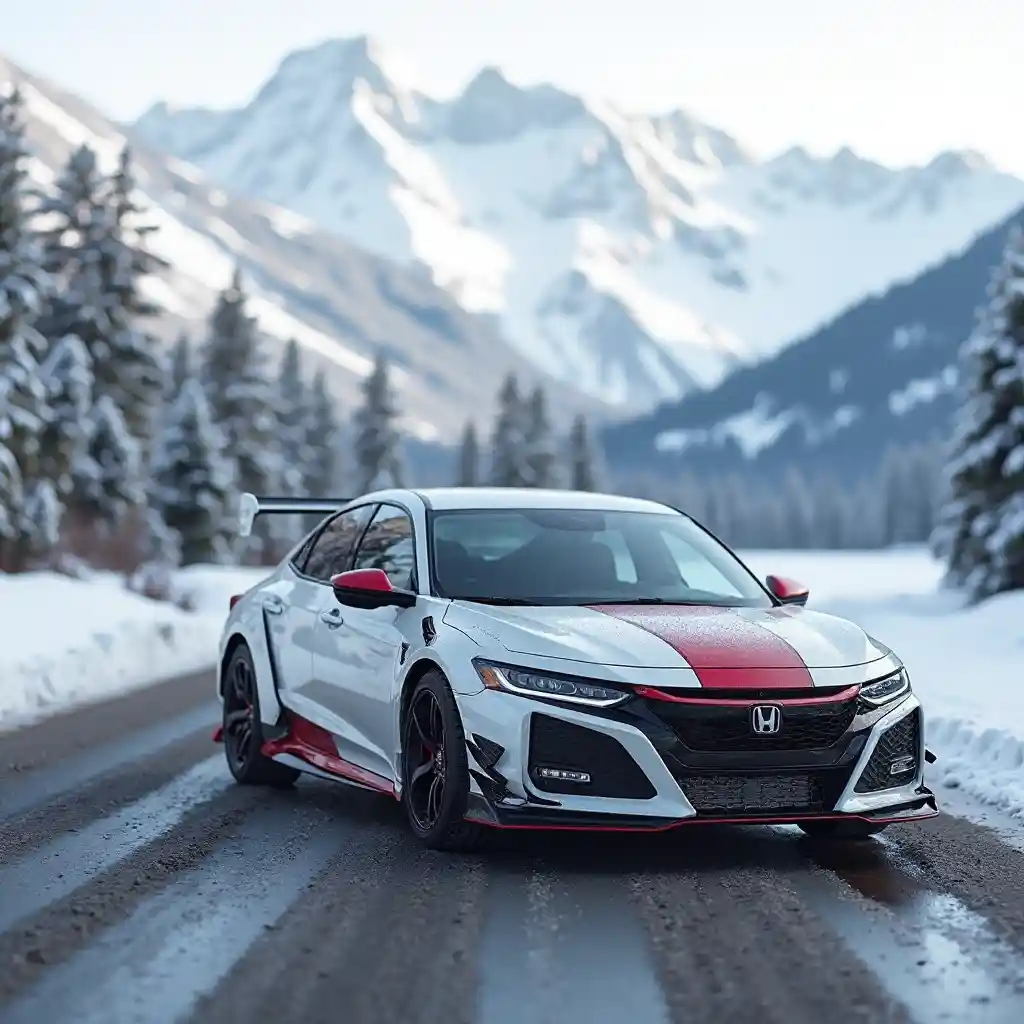 빨간색과 검은색 바디 키트와 우아한 검은색 림과 눈 덮인 산의 데드 드롭으로 흰색 혼다를 만듭니다. 완벽한 카펫 도로에서 모든 유색 유리와 타이어는 4k HD 곡률이어야 합니다.