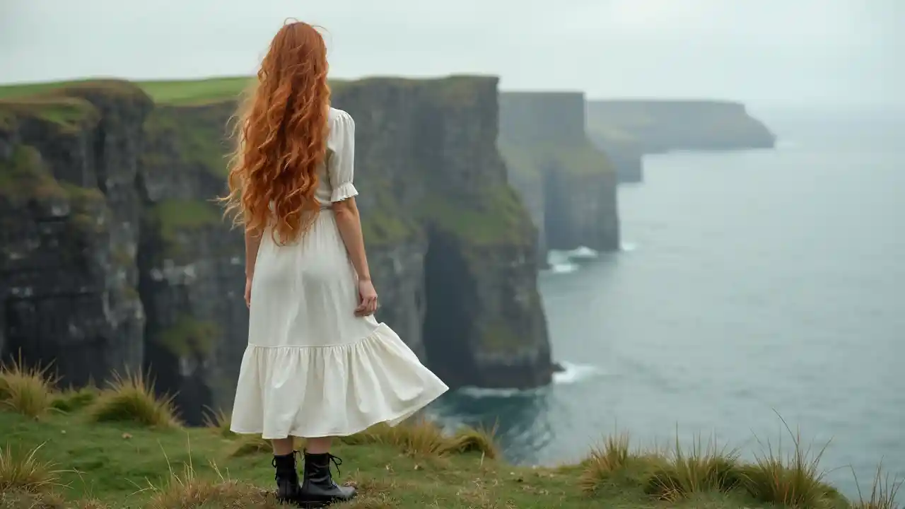 모흐의 절벽 위에 서 있는 20세 여성이 흰색 실크 상의에 흰색 면 드레스, 검은색 발목 부츠를 신고 진저색의 긴 곱슬머리를 하고 있는 사실적인 클로즈업 스튜디오 사진, 정말 귀엽다