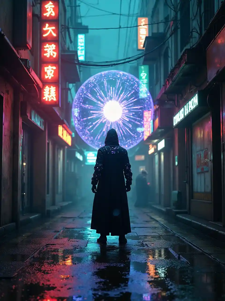 장면 설명 ( 초현실/영화 ) : 깜빡이는 한자 네온사인 간판과 엉킨 케이블로 둘러싸인 새까맣고 비에 흠뻑 젖은 사이버펑크 골목길.분쇄된 통풍구에서 쉰 소리가 났고 웅덩이는 도시의 다채로움을 반영했습니다.중간 프레임에서 6′3″V는 빛나는 빨간색과 파란색 회로와 함께 자신의 갑옷 검은 망토에 홀로 서 있습니다.그의 앞에는 펄스하는 에너지 구체(보라색, 전기 파란색, 녹은 황금빛으로 구성된 소용돌이 연결)가 젖은 콘크리트에 동적 반사를 던집니다. 카메라 이동: 0:00 – 0:03s 저각 크레인 사격 ( 등 뒤 ) : 발목 높이의 V 뒤에서 시작하여 위쪽과 앞으로 들어 올려 구체에 접근하는 상황을 추적합니다.빗방울이 렌즈를 스치다. 0:03 – 0:06s Smooth Dolly-In to medium shot ( side ) : 가슴의 높이가 오른쪽으로 넘어가면서 Dolly closer as V의 가슴이 각 호흡의 기복과 함께 구체의 빛이 강해진다. 0:06 – 0:08s 횡방향 + 호: V의 전방을 향해 느리고 이음매 없는 호를 그리며 구체의 일그러진 빛이 골목 벽에 파문을 일으키는 것을 보여줍니다. 0:08 – 0:10s 다이나믹 푸시 + 클로즈업: 구의 빛이 솟구칠 때 V 눈의 극한 클로즈업 ( 지금 개방 ) , 저각도로 푸시 - 후 검은색으로 절단. 조명 : Key Source: 구 자체 - 보라색의 황금색 펄스 - V의 얼굴에 움직이는 패턴을 시전한다. 림 라이팅: 레드 사이니지 ( 왼쪽 ) 와 청록색 환풍구 ( 오른쪽 ) 의 거친 네온 엣지가 그의 실루엣을 형상화시켰다. 채우기: 골목의 젖은 표면과 머리 위의 고정 장치에서 부드럽고 확산되는 주변 광채. 대기 효과: 빗물과 증기에서 역방향으로 빛이 흩어지며, 물방울이 구의 빛을 포착하면 미세한 렌즈 플레어. 스타일 및 기술 사양: 렌더링 스타일 : 사진의 실제 피부, 패브릭, 비와 함께 매우 현실적인, 영화 CG. 프레임 속도 및 해상도: 24fps, 4K, 2.39:1 변형 비율. 렌즈 및 깊이: 35mm 변형 렌즈를 시뮬레이션하고 얕은 피사계 깊이 - V의 눈을 예리하게 초점을 맞추고 배경은 부드러운 보케입니다. 색상 등급: 변덕스러운 청록색 - 주황색 대비, 높은 대비 그림자, 미묘한 필름 패턴.