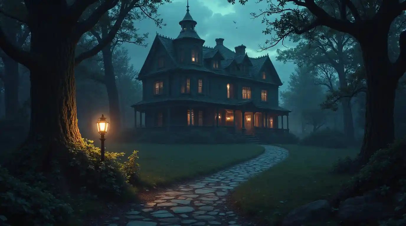 퍼진 저택, 저주받은 유물이 숨겨져 있는 방이 어둡고 신비로운 애니메이션 분위기를 이끈다.