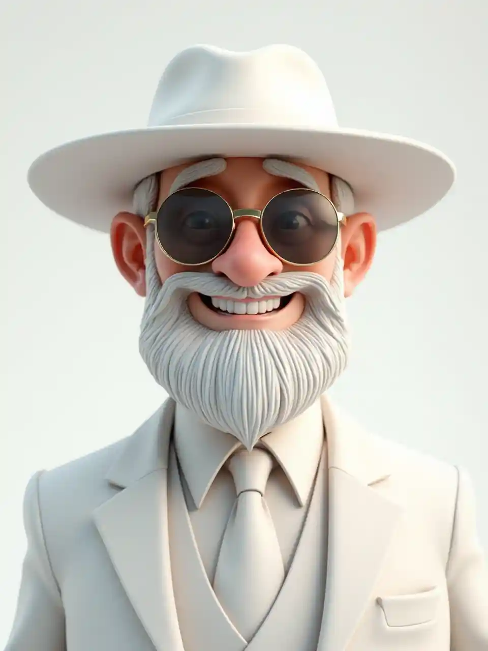 3D 만화 사진 세련된 흰색 양복에 잘 어울리는 와이드 캡을 착용한 흰 수염의 저명한 노인, 큰 반사 선글라스를 착용한 가운데 곧은 입술이 환하게 웃고 있습니다.