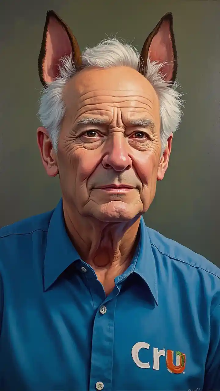 'CRU'와 로고가 새겨진 파란색 셔츠를 입은 강아지 귀 노인 초상화.