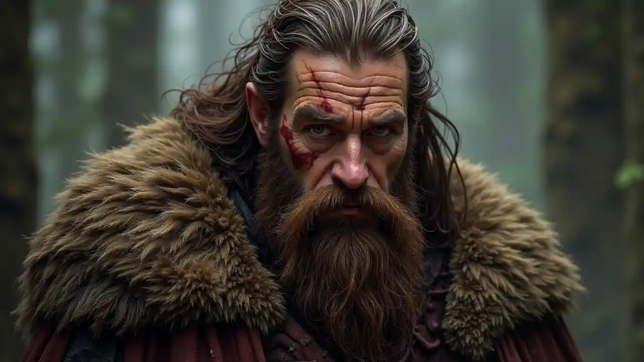 다크 판타지 드워프 바바리안, 55세, 갈색 머리, 긴 수염, 갈색 눈, 왼쪽 아래에 흉터