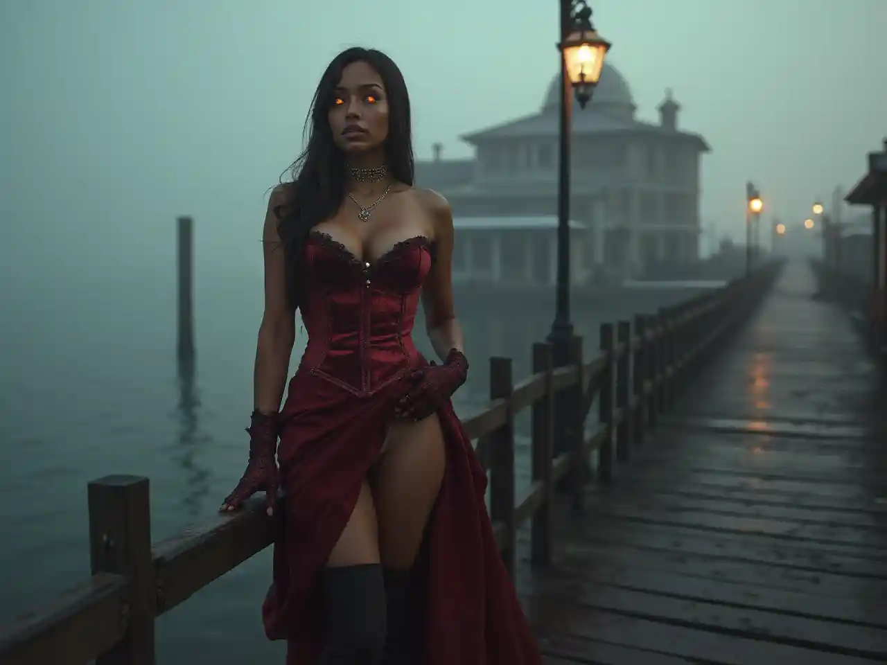 매혹적인 흑단 피부의 빅토리아 시대 매춘부는 안개가 자욱한 항구 부두에 새벽에 자신 있게 서 있으며, 어깨에 곧은 머리를 한 짙은 노란색 머리카락이 중앙에 퍼져 있습니다.그녀의 반짝이는 호박색 눈은 신비로운 빛을 발산하고 있다.그녀는 낮은 네크라인이 있는 짙은 빨간색의 타이트한 드레스를 입고 레이스 목걸이와 섬세한 보석으로 그녀의 넓은 가슴을 강조했습니다.그녀의 복장은 자극적이고 시대에 부합합니다. 암시적인 레이스 장갑과 벨벳 슬릿 스커트, 하이 삭스와 발목 부츠가 노출되어 있습니다.안개가 나무 부두 주위를 감싸고 희미한 가스 램프가 부드러운 그림자를 드리웁니다.
