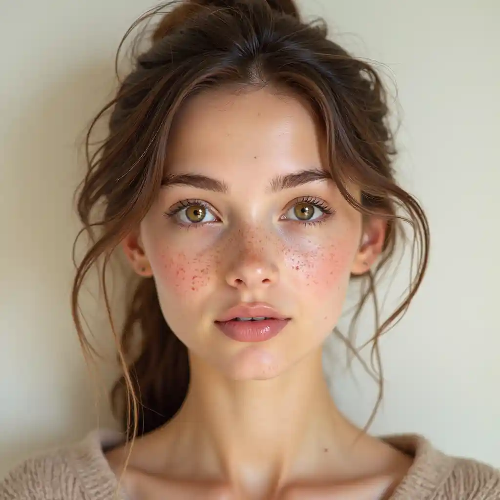 얼굴은 타원형이며 부드럽고 균형 잡힌 외관을 제공합니다.당신의 눈은 크고 온화하며 눈은 깊고 표현력이 있습니다.당신의 눈썹은 통통하고 윤곽이 뚜렷하여 자연스럽게 얼굴을 그립니다.당신의 코는 작고 섬세하며 다른 특성과 아름답게 조화를 이룹니다.당신의 입술은 부드럽고 자연스러운 장미 톤으로 가득 차 있고 단정합니다.당신의 피부는 희고 희미한 주근깨가 있어 젊음의 독특한 매력을 더합니다.