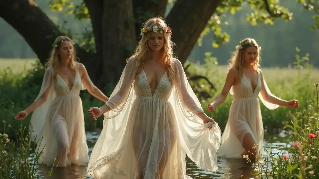 통통한 몸매를 가진 긴 금발의 젊은 미녀((투명한 젖은 흰색 드레스, 우아한 디자인, 복잡한 꽃 패턴으로 장식, 섬세하지만 복잡한 꽃으로 장식된 머리카락).의상은 고대 슬라브 이교 전통을 연상시키는 기쁨과 평온한 정신을 발산하며 ) ) ) 및 ( 극적인 액션 포즈 ) , 만개한 꽃으로 둘러싸인 나무 ( 늪의 오래된 참나무 ) 를 중심으로 춤을 추며 기발한 터치를 더합니다.배경은 나무와 여성의 색과 그림자를 강조하기 위해 부드러운 자연 빛으로 조명 될 수 있습니다.