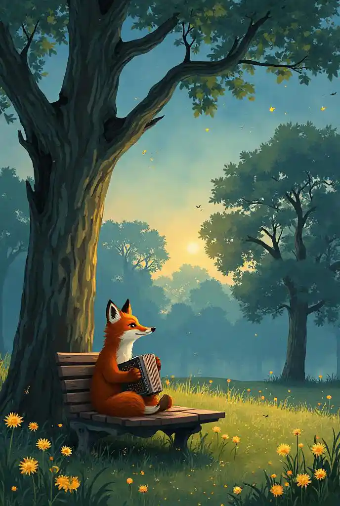 황혼의 공원, 나무에는 얼굴이 있고, 여우는 벤치에 작은 아코디언을 연주하고, 민들레는 빛나는 씨앗을 방출하여 반딧불이로 변하고, 전쟁의 수채화