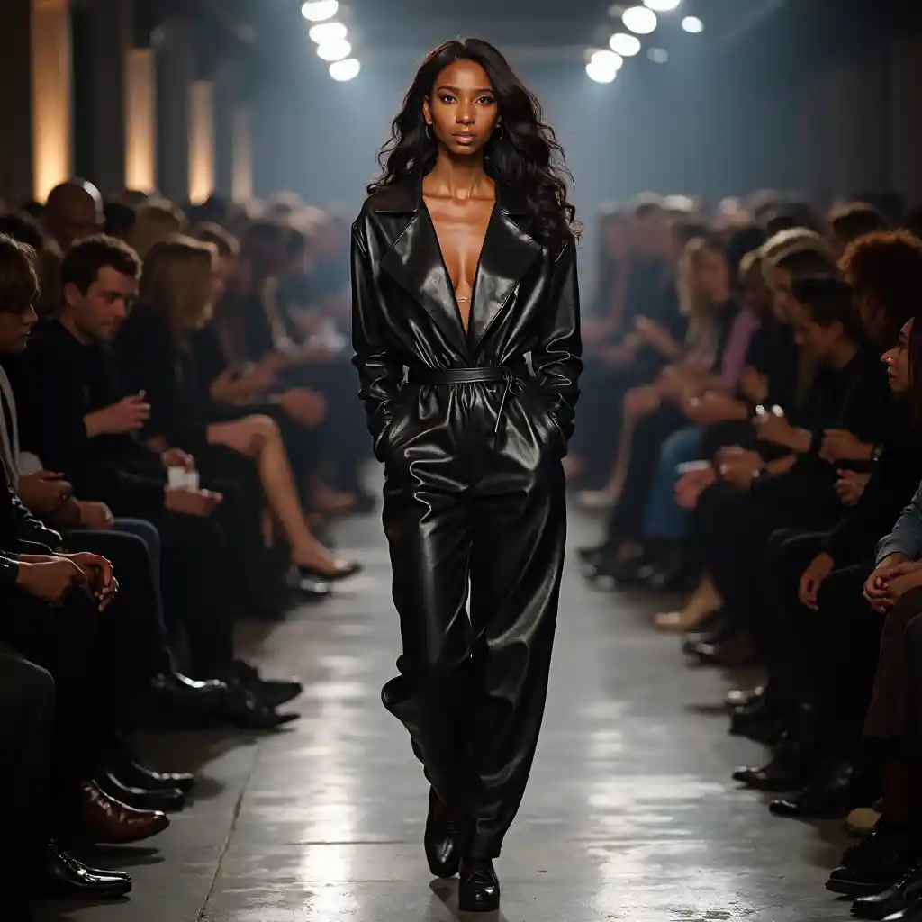 패션쇼에서 가죽 점프수트를 입은 자신감 넘치는 흑인 여성