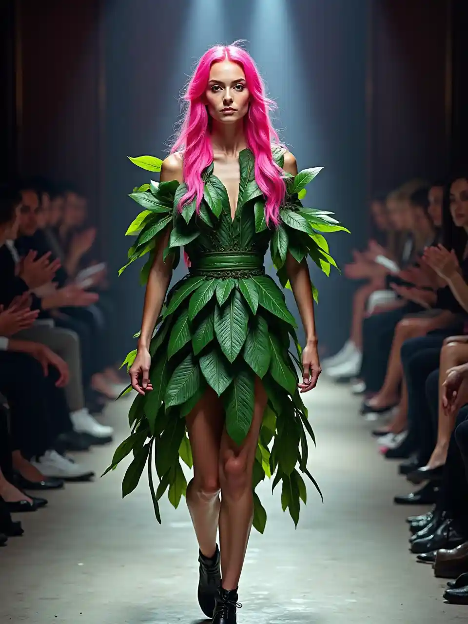 유럽 여성 모델들은 짧은 핑크 머리, 네온 메이크업, 밝은 눈, 맑은 입술, 그녀를 향한 불빛, 관객들의 박수를 받으며 패션쇼 런웨이를 걸어 내려갔다.