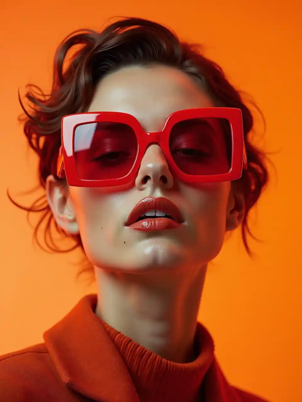 두꺼운 선글라스와 두꺼운 빨간 테를 가진 여성의 초상화, 밝은 색상, 스튜디오 사진, 패션 사진, 피에르 카르단 스타일 이미지