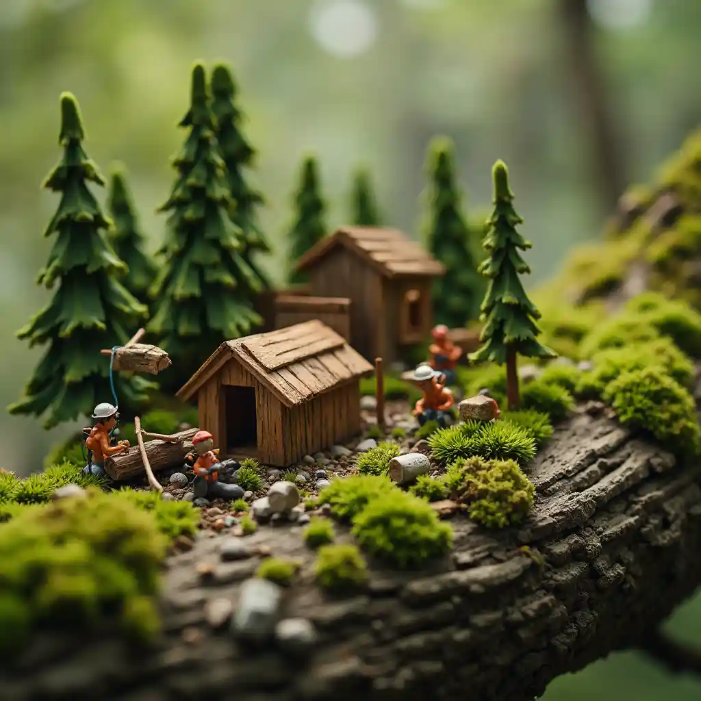 "매우 상세한 매크로 샷, 작은 작업자가 거친 나무 껍질 위에 숲 마을을 만듭니다.어떤 사람들은 목조 가옥을 조각하고 다른 사람들은 이끼 정원을 심고 나뭇가지로 만든 크레인이 작은 통나무를 들어 올립니다.따뜻하고 유기적인 환경이 하나가 됩니다.
