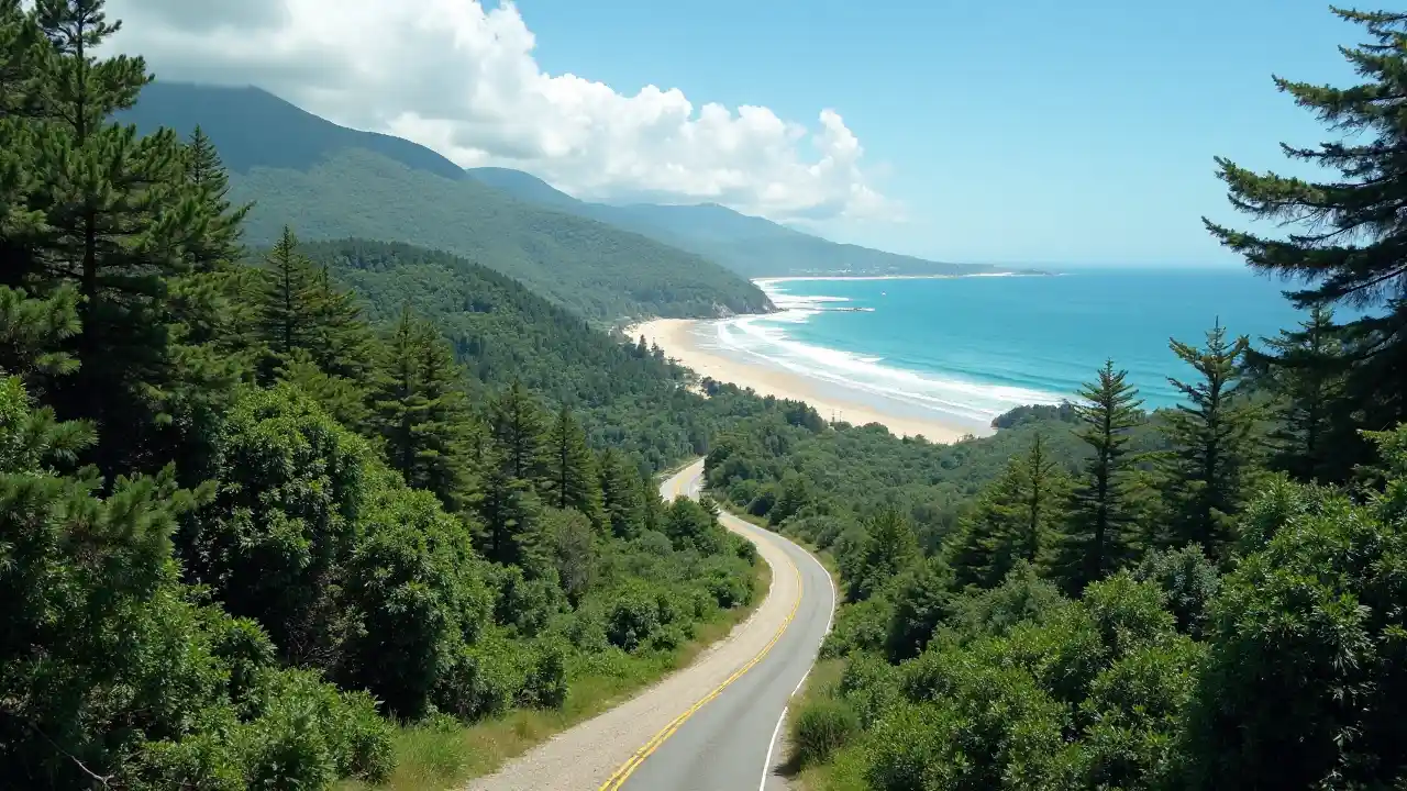 바다를 향해 구불구불한 숲길과 푸른 산과 푸른 하늘, 푸른 하늘과 맑은 하늘이 펼쳐져 그림 같은 평화로운 분위기를 자아낸다.도로는 해변으로 이어지며 파도가 우아하게 휘날리며 바다의 고요함과 고요함을 드러냅니다.