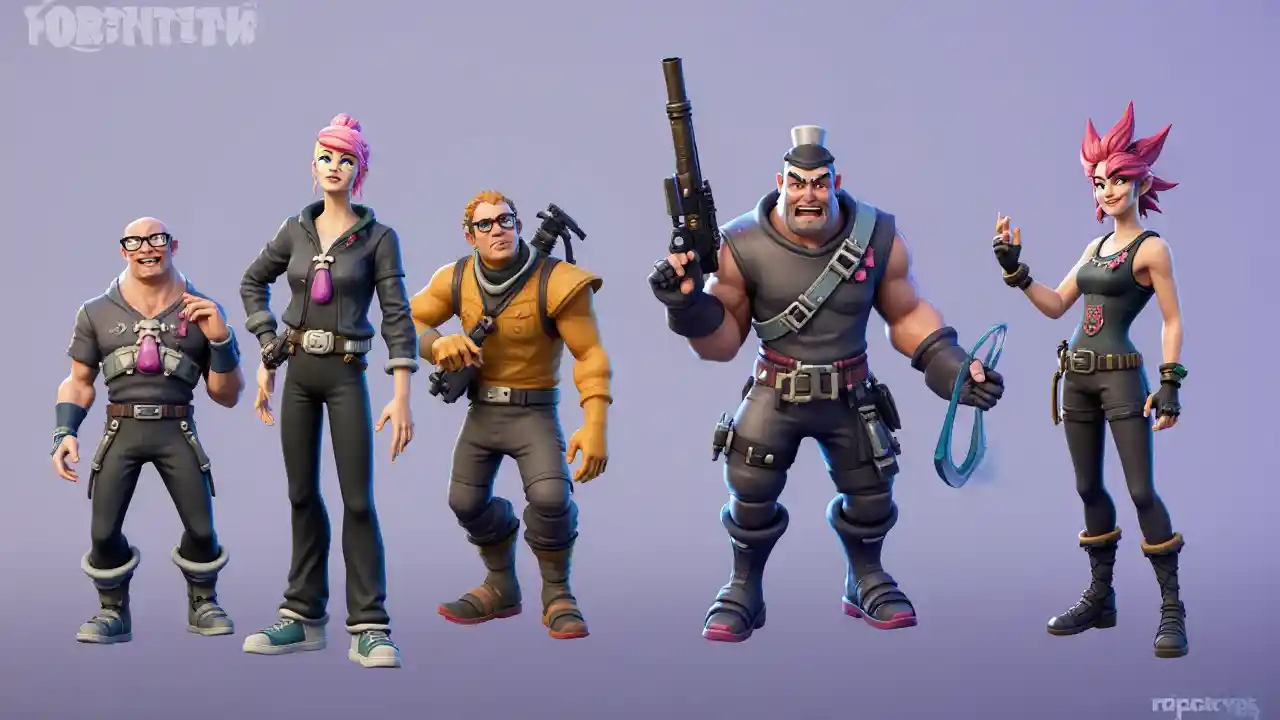 FishStick 등을 포함한 포트나이트 캐릭터들이 무기를 들고 사진을 찍고, 아래에 레어 태그가 있다.