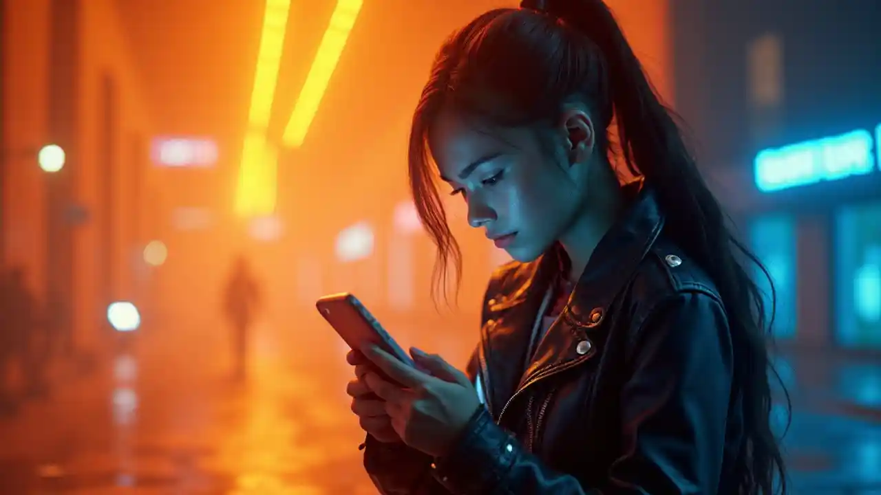 밝은 배경에 주황색-파란색, 기술, 가죽 재킷을 입고 휴대폰을 보고 있는 젊은 미소녀.옥탄가 렌더링, 비현실적인 엔진, 사진, 사실적인 피부 텍스처, 사실적, 초현실적, 높은 디테일, 하드 실루엣 라이트 블루
