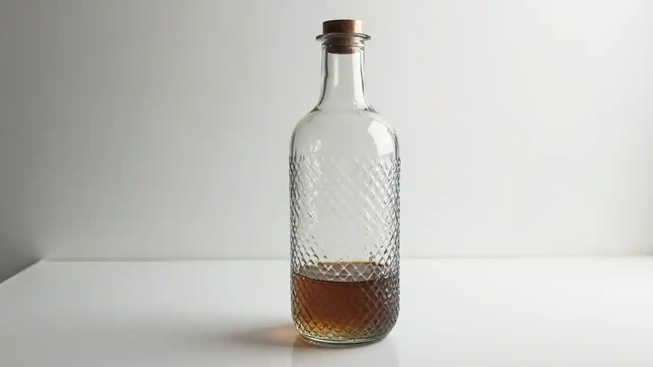Botella alta minimalista cilindrica con textura de vidrio cortado de 750 militros con 39 cm de altura,sin etiqueta con un difuminado negro que parte de la parte below。 con liquido muy claro en un set de fotograf í a minimalista。 tapon de cobre golpeado