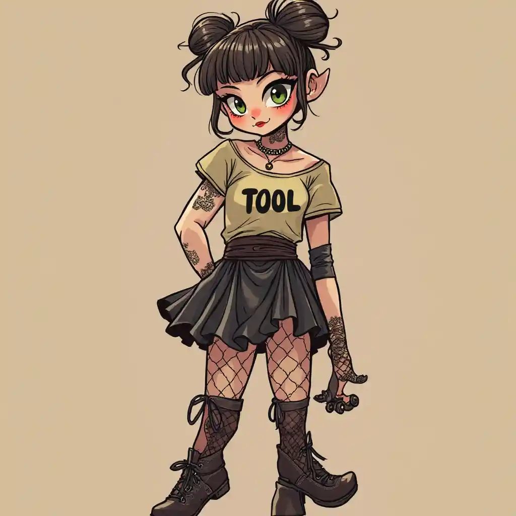 하이브 헤어에 TOOL 티셔츠, 코르셋, 치마, 그물, 하이힐을 입은 애니메이션 스타일의 고스걸.