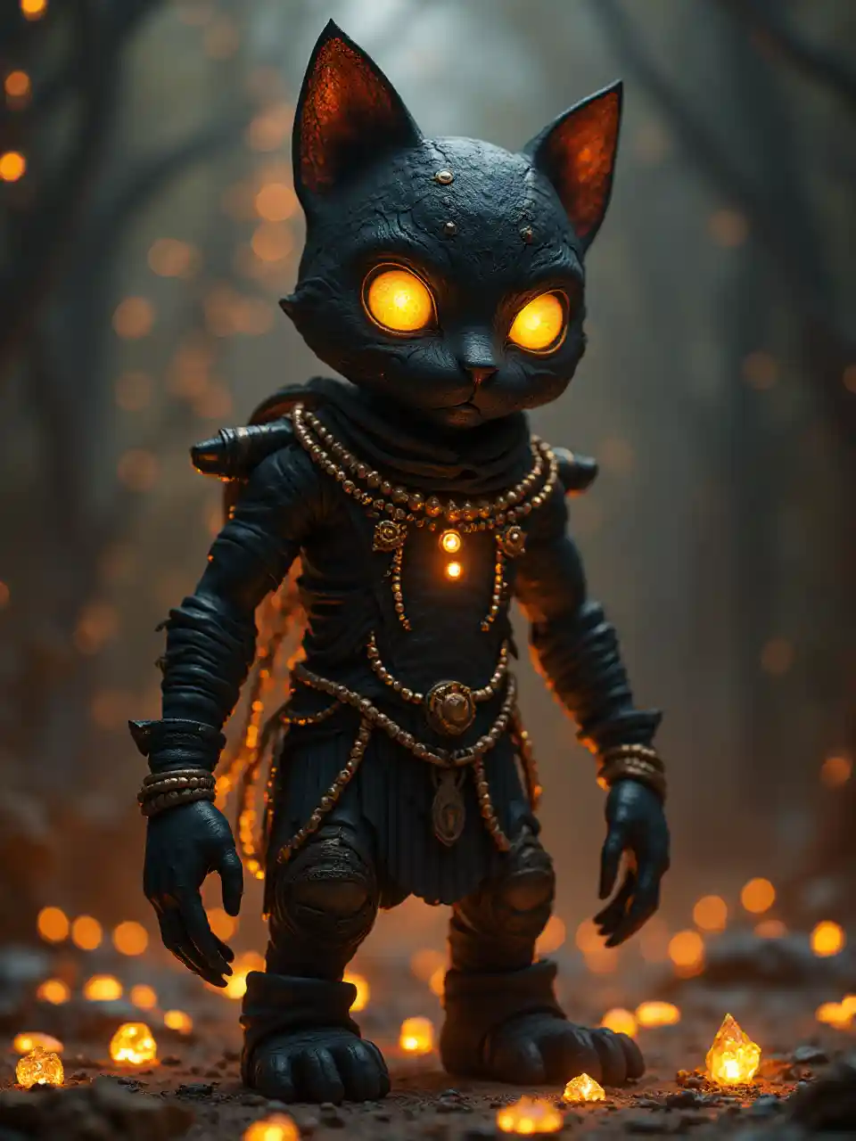 Kitty[의인화 된 고양이 인간], 전신, 빛나는 눈, 보는 사람, 어두운 환상의 악마, 고딕 네트워크, 무서운 이집트 신화, 신비한 황금 와이어, 점수 빛나는 크리스탈, 컬트 의식, ( 걸작 : 1.2 ) : : ( 최고 품질 : 1.2 ) : : : ( 복잡함 ) : : ( 벽지 ) , 글로벌 조명, 빛 추적,