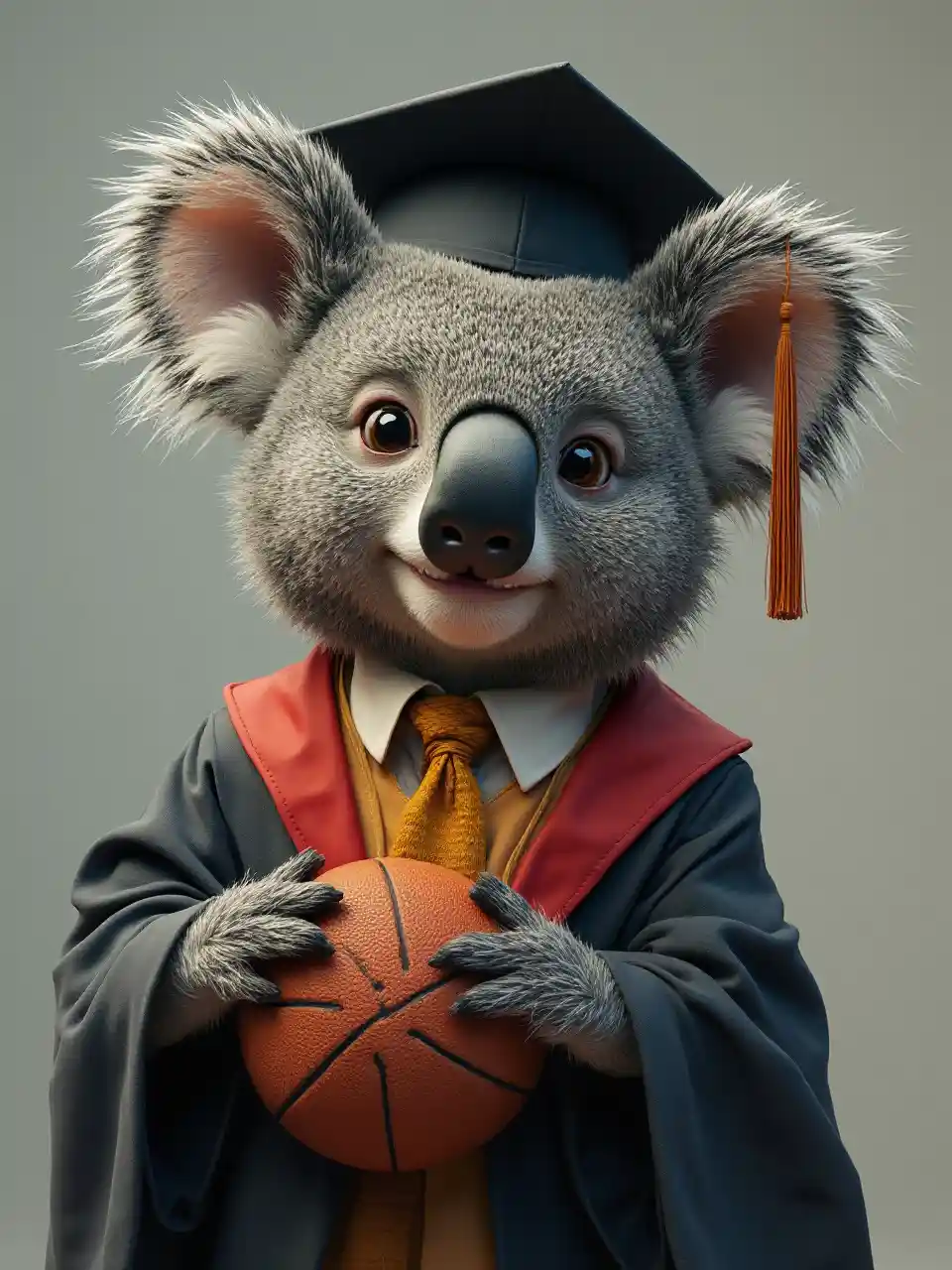 코알라는 졸업복에 농구 넥타이를 매고 있습니다.