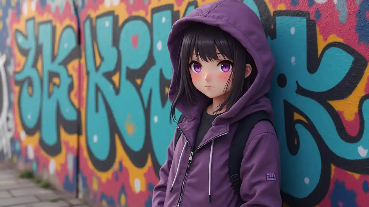 1 소녀, 동양인, 태국인, 자켓과 모자를 입고 낙서 벽 앞에 서서 보라색 후드티를 입고 배경에 낙서