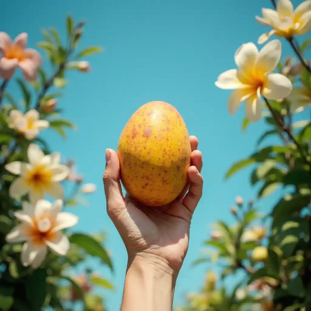 푸른 하늘과 열대 꽃을 배경으로 망고를 들고 있는 한 손