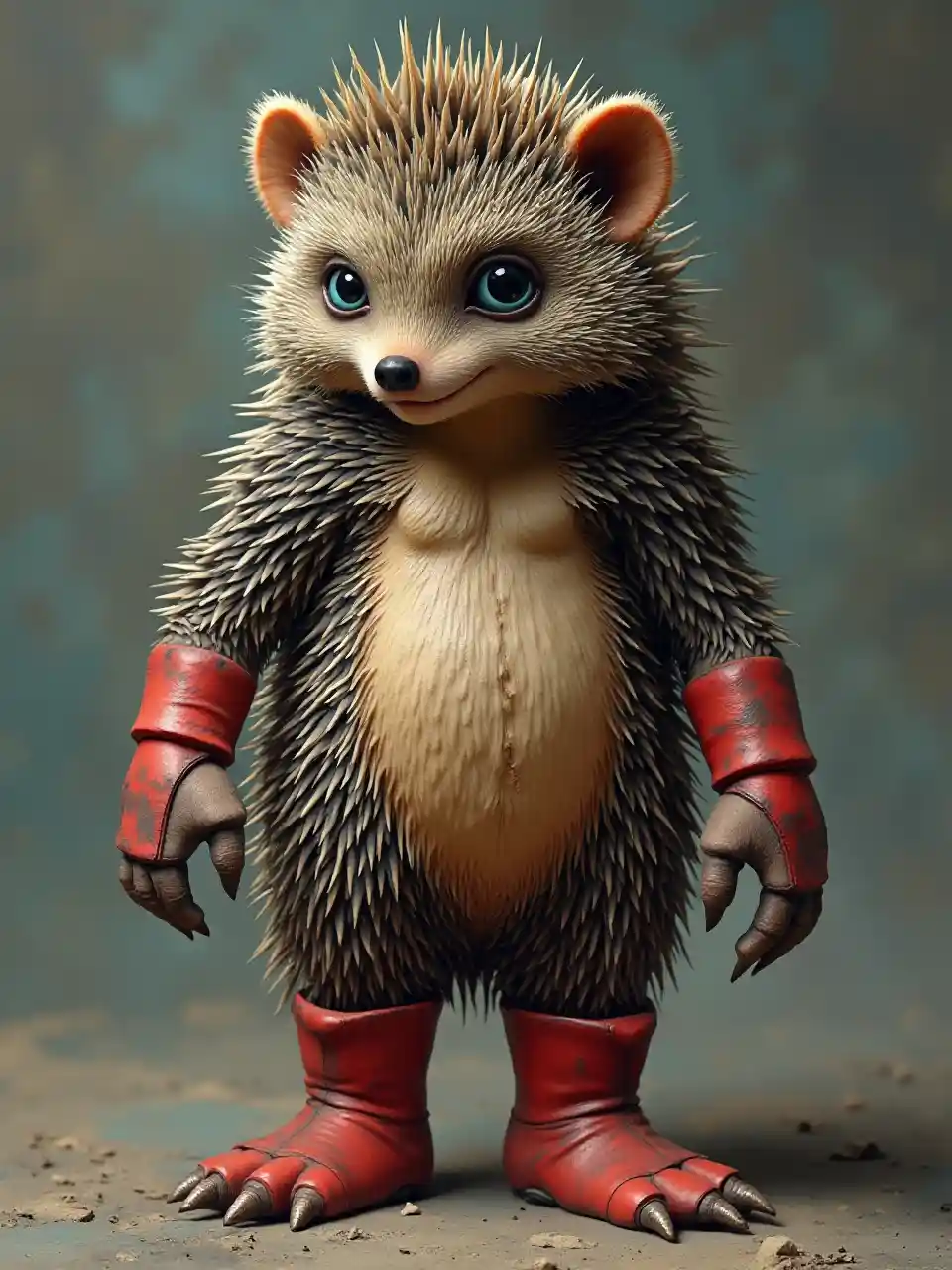 고슴도치는 사람처럼 키가 크지만 고슴도치의 몸은 인육에 가려져 있으며 발톱이 달린 빨간 장화를 신고 있다.