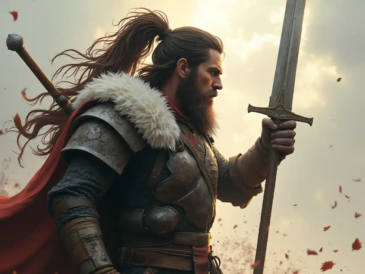 판타지아트에 격렬하게 표현된 검을 뽑는 영웅전사의 서면관