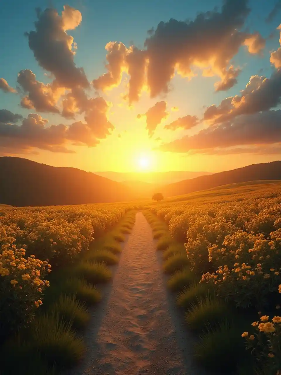 : 일출은 평화로운 풍경 위에 있으며, 새로운 시작과 희망을 상징하는 아침 해로 통하는 길이 있다.