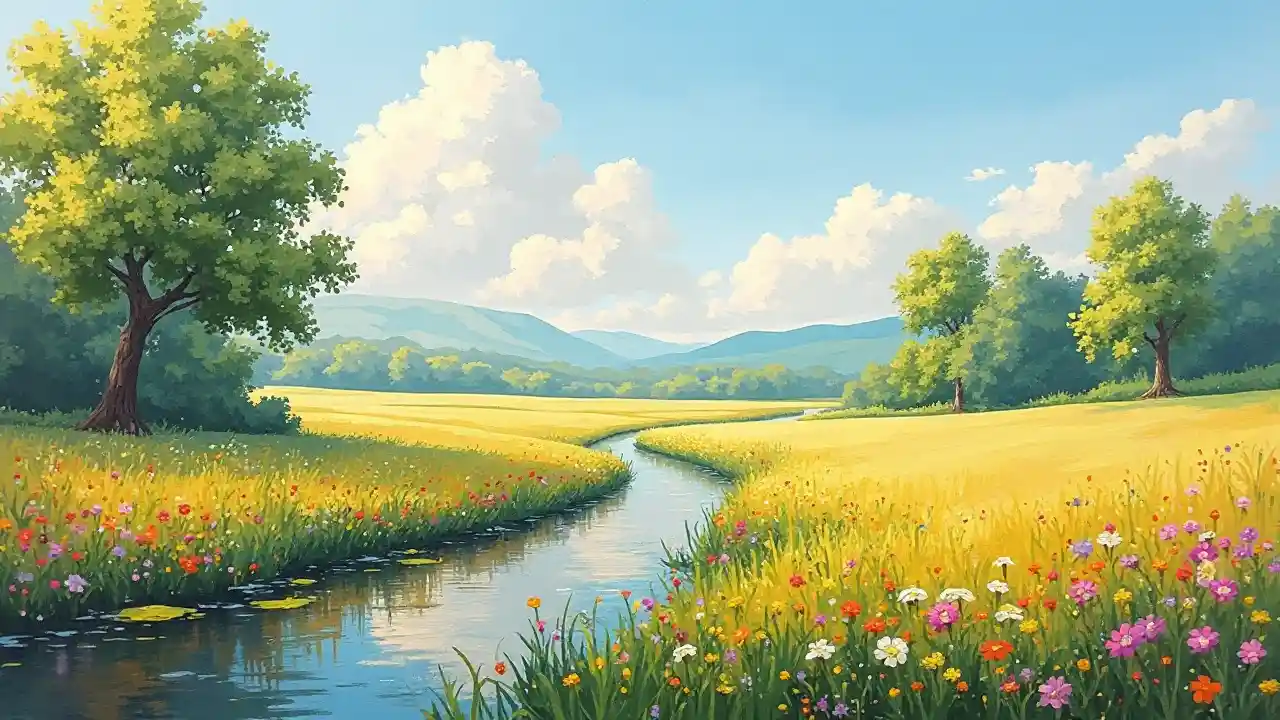 인상파 양식의 그림을 한 폭 생성하다. 밭과 나무와 화초와 강과 하늘이 있는 정적인 풍경이니라
