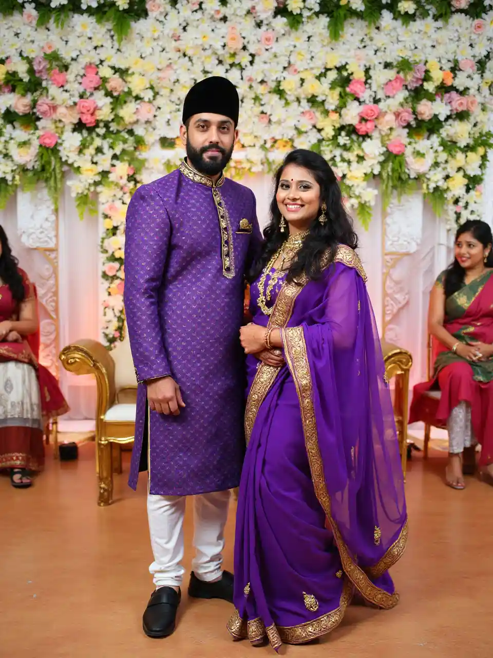 사진은 아름다운 꽃 배경 앞에서 사진을 찍는 젊은 인도 부부의 모습을 보여줍니다.남성은 금색 자수와 검은색 모자를 쓴 전통적인 보라색 쿠르타를 입고 있고, 여성은 셔츠에 보라색 사리를 입고 있습니다.그들은 모두 미소를 지으며 카메라를 바라보았다.배경은 화려한 꽃과 녹색 식물로 장식되어 있으며 배경에는 빨간 의자에 앉아있는 두 명의 여성이 있습니다.이미지의 전반적인 분위기는 축제와 축제입니다.