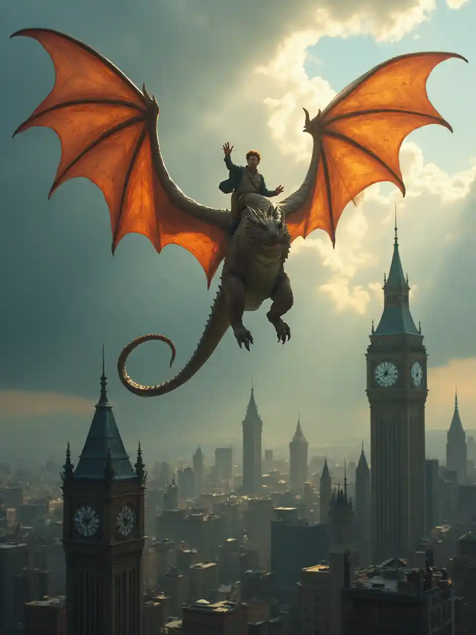 수리된 드래곤이 도시 위로 날아오르며 날개가 기운을 반짝인다.시계탑의 톱니바퀴가 다시 돌아가면서 폭풍의 구름 부분이 햇빛을 비추었다.용의 등에 손을 흔드는 발명가