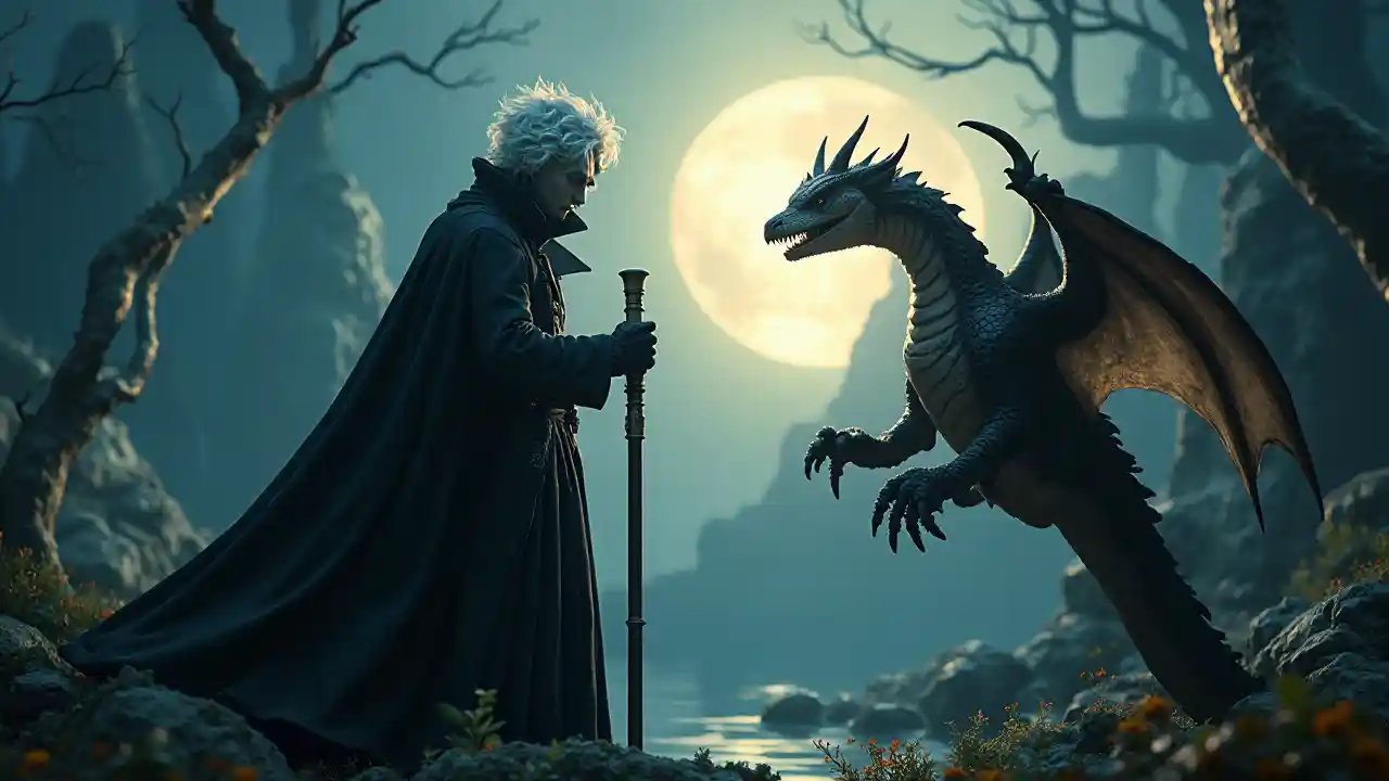 잭 프로스트가 드래곤에 앉아 딸꾹질을 하면서 지팡이에 앉은 채로 반으로 쪼개지는 그림을 만들어낸다.