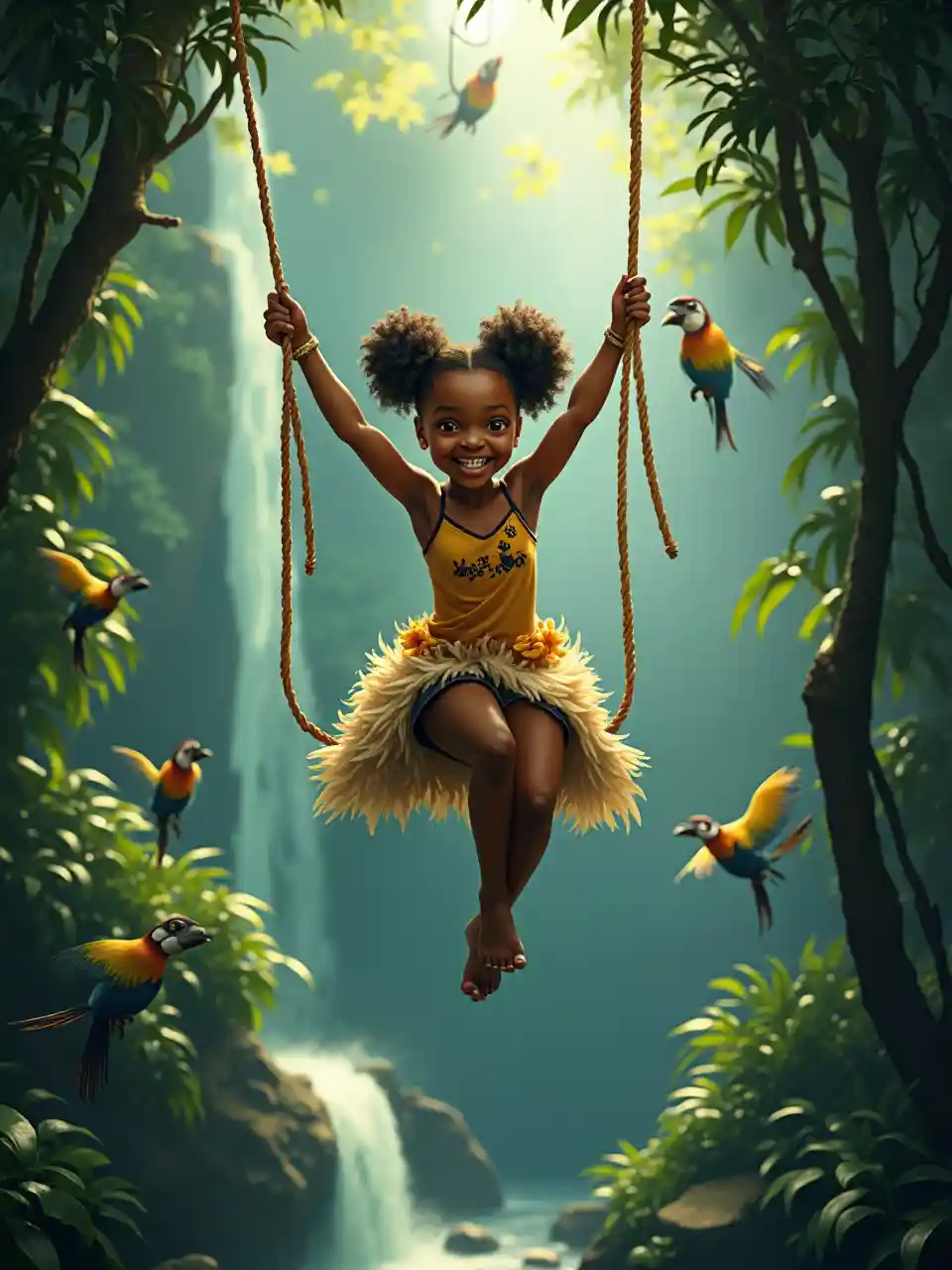 정글에서 빛나는 밧줄로 그네를 타는 8세의 퍼프 흑인 소녀는 깃털 억양이 있는 드레스를 입고 있습니다.이국적인 새와 흐릿한 폭포가 그녀의 틀을 잡았고, 그녀의 경쾌한 호는 울창하고 몽환적인 환경에서 거친 에너지와 평온한 기쁨을 발산했습니다.