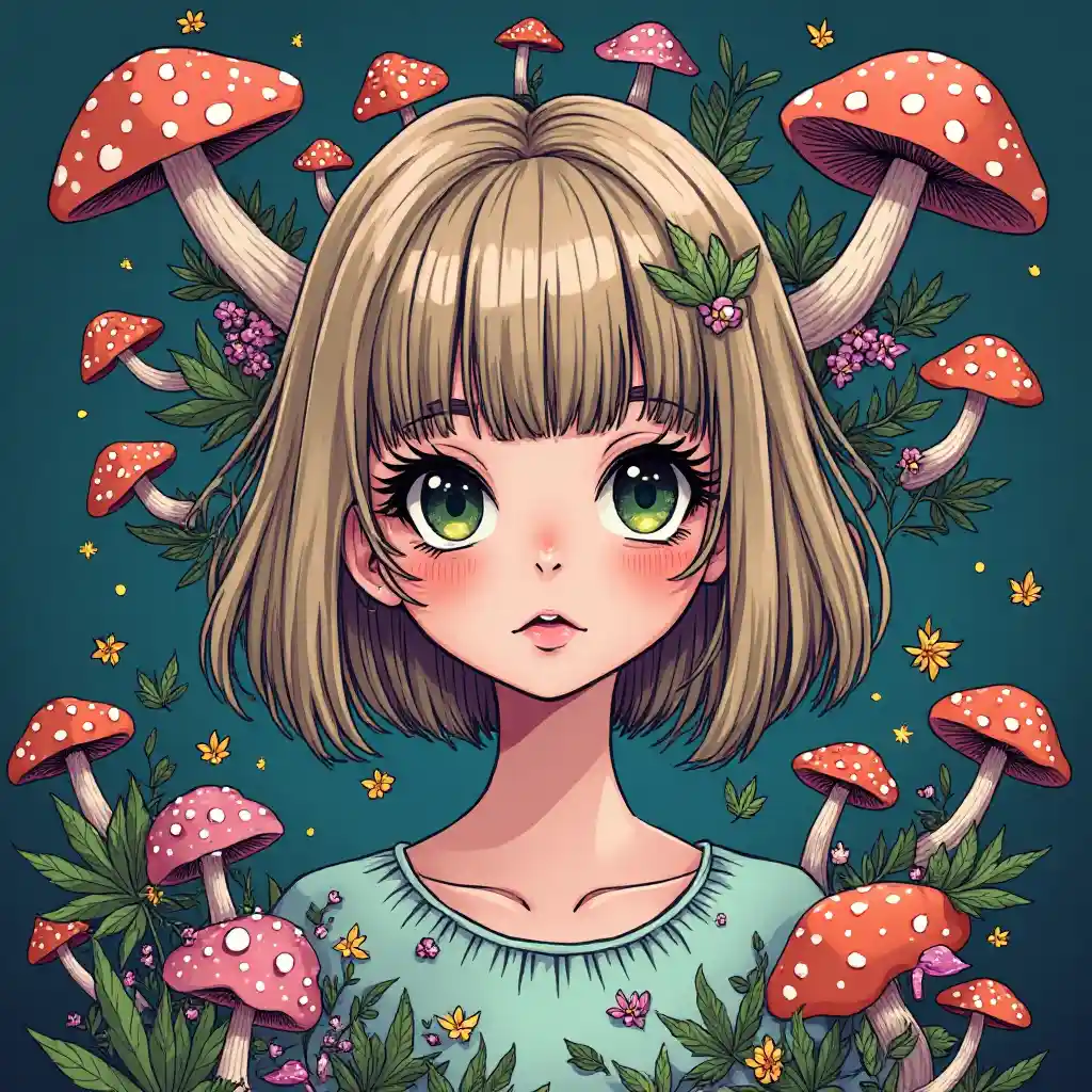 버섯과 마리화나를 곁들인 카와이식 사이키델릭 약 머리 속에서.머리 머리 앞머리와 밥