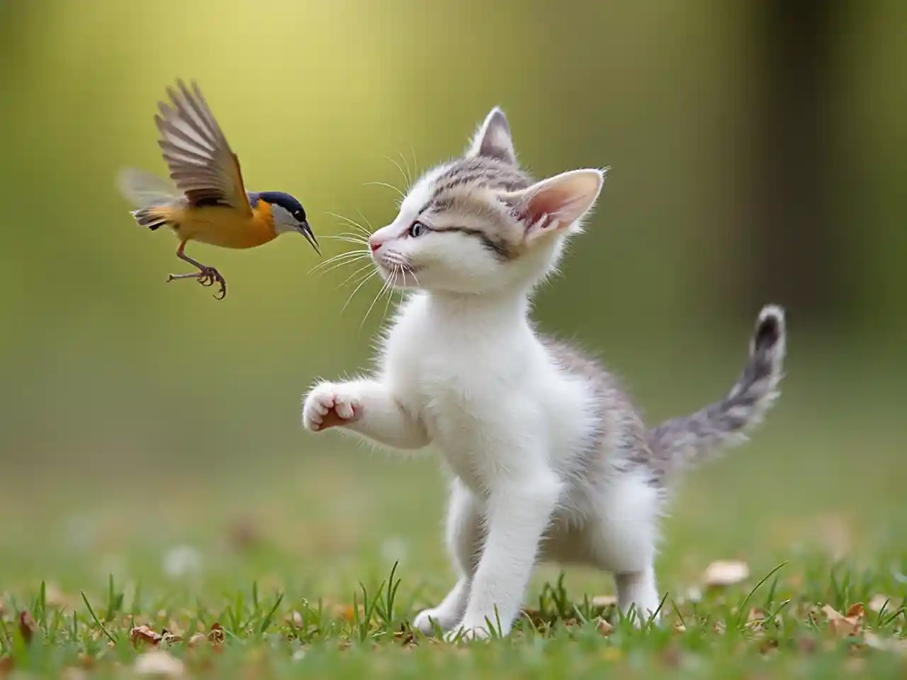 흰색과 회색 줄무늬 고양이 tryinggg 예쁜 장난꾸러기 새를 잡아