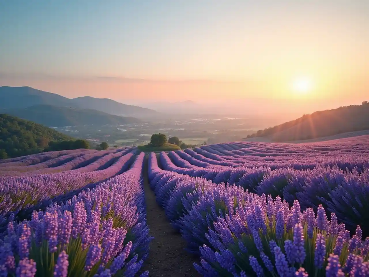 풍경을 확장하고 구불구불한 언덕이 햇빛을 더합니다.라벤더 낮추기