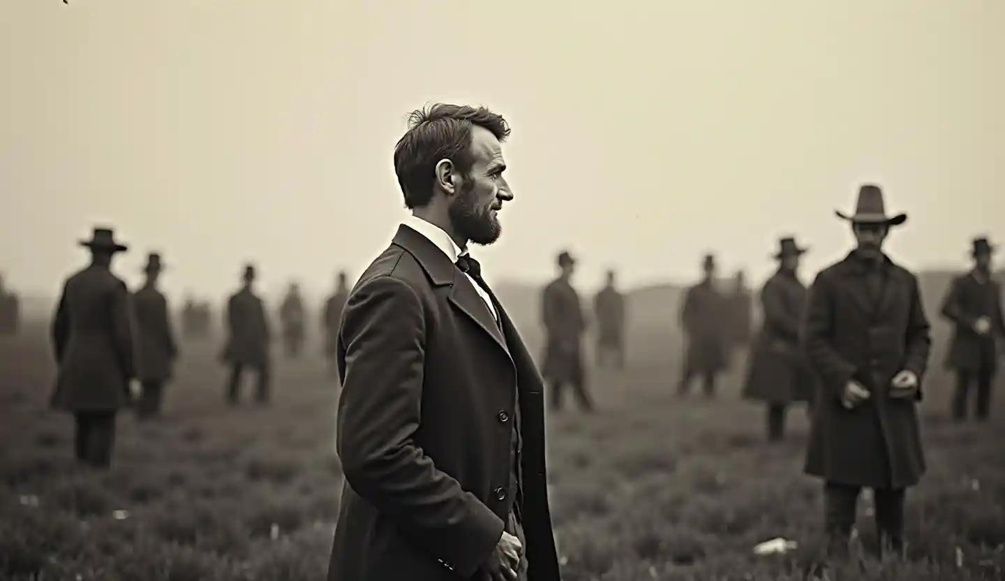 미국 남북 전쟁의 전장에서 에이브러햄 링컨의 퇴색된 오래된 흑백 사진을 상상해 보십시오.
