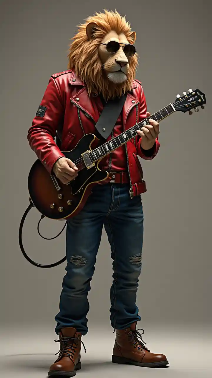 빨간색 가죽 재킷과 청바지 바지를 입고 신발을 신고 기타를 들고 8k, 언리얼 엔진 렌더링, 전신에 선글라스를 착용한 리얼리티 라이온