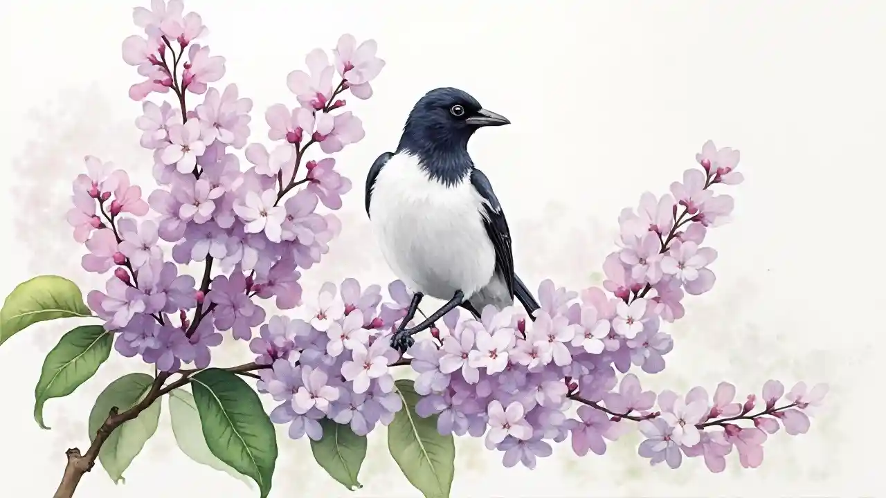 유라시아 까치 만개한 하얀 라일락에 앉아 수채화
