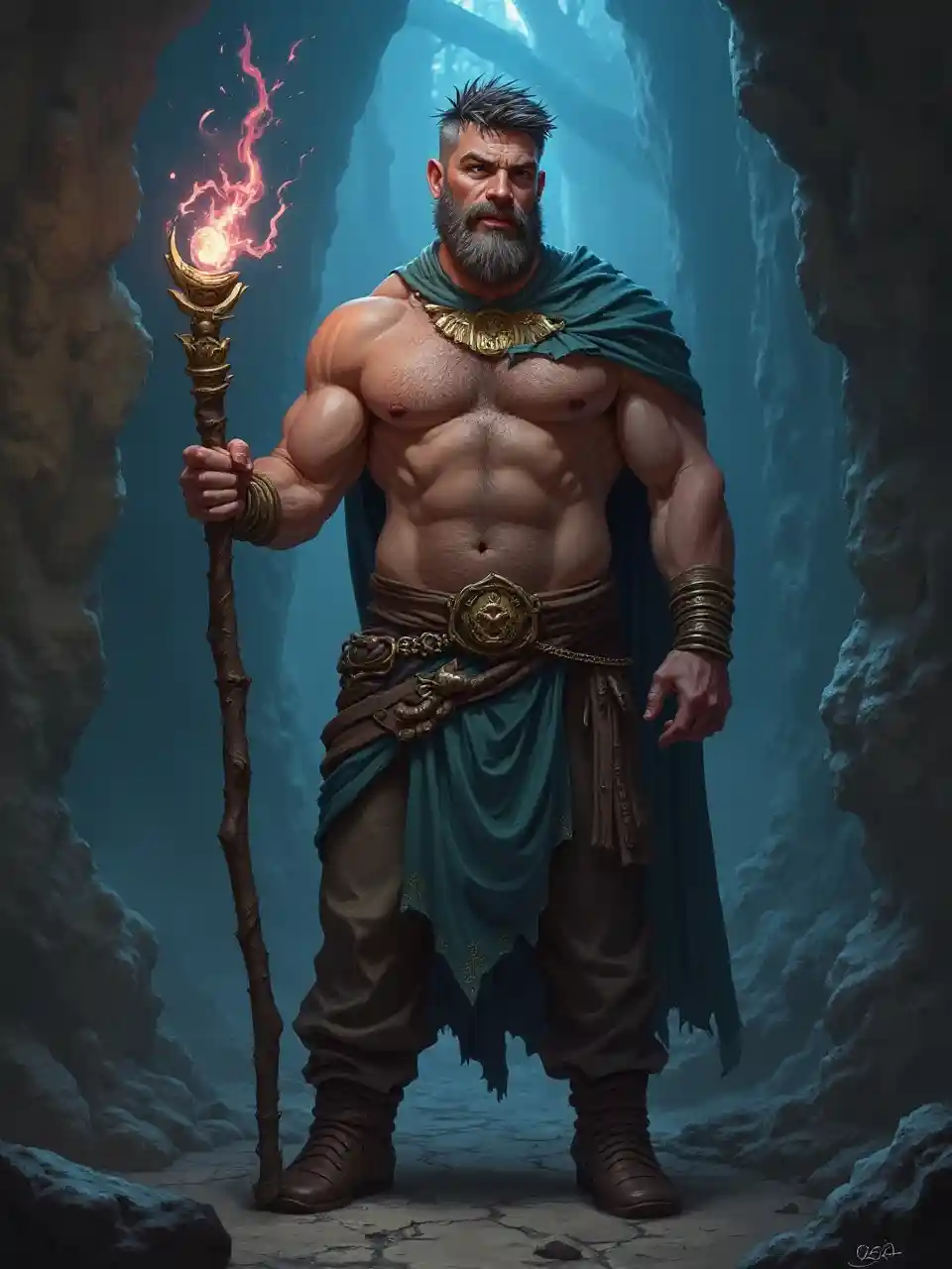 Noah( 전신 ) 수컷의 땅딸막한 신비로운 마법사, 짧은 머리의 수염, 소용돌이 불빛이 있는 지팡이를 들고 있으며 셔츠를 입지 않고 가슴은 털털, 어두운 지하 던전의 신전, 패스파인더, d&d 세트, 사실적인 디지털 아트 스타일